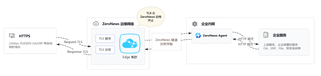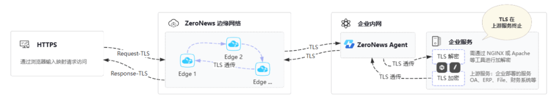 典型适用场景:对 ZeroNews 平台信任度较高,但又不希望业务数据暴露明文的场景;需要使用自有域名且能接受在 ZeroNews 平台管理证书的场景。