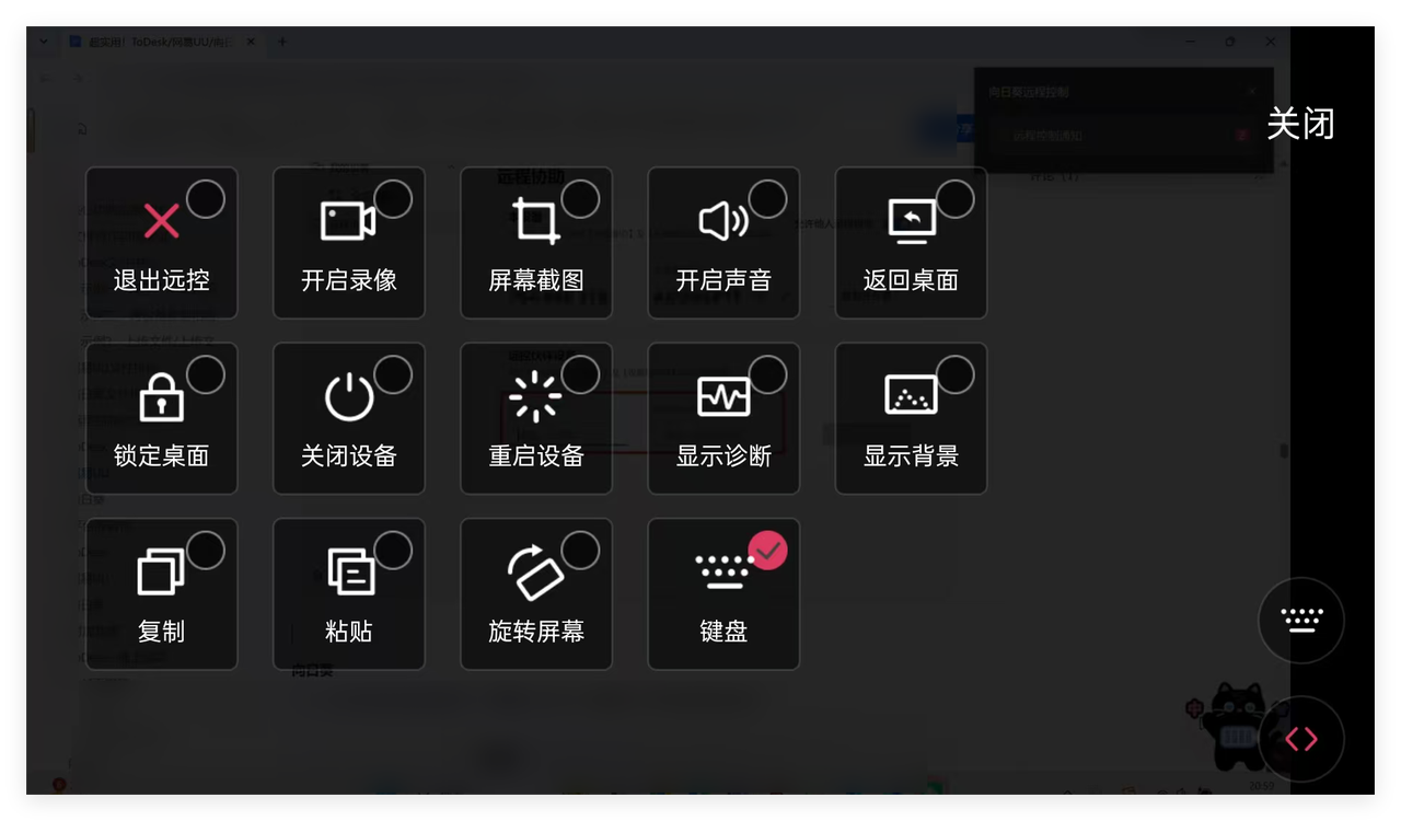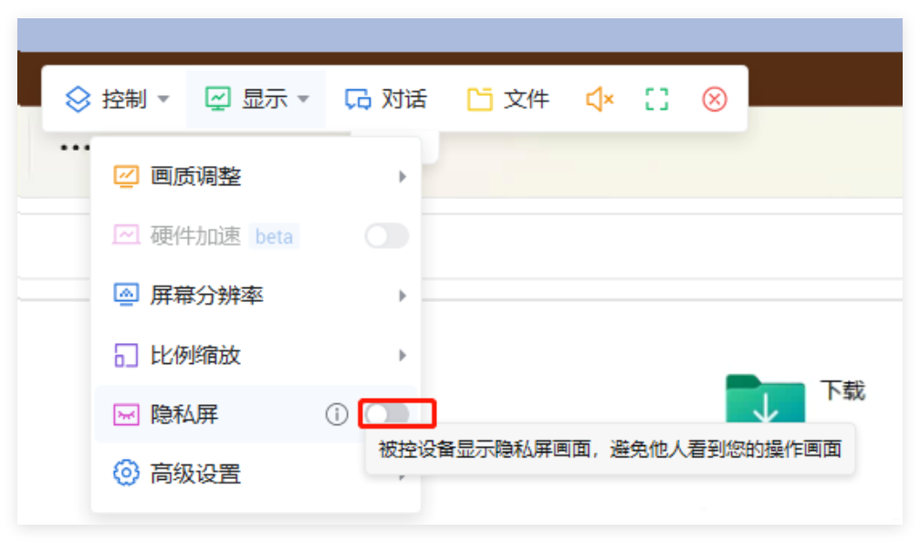 ToDesk的【隐私屏】,想要开启隐私屏,需要在进入远控界面后,远控界面上方的菜单栏中,找到【显示】,点击旁边的按钮即可开启隐私屏。