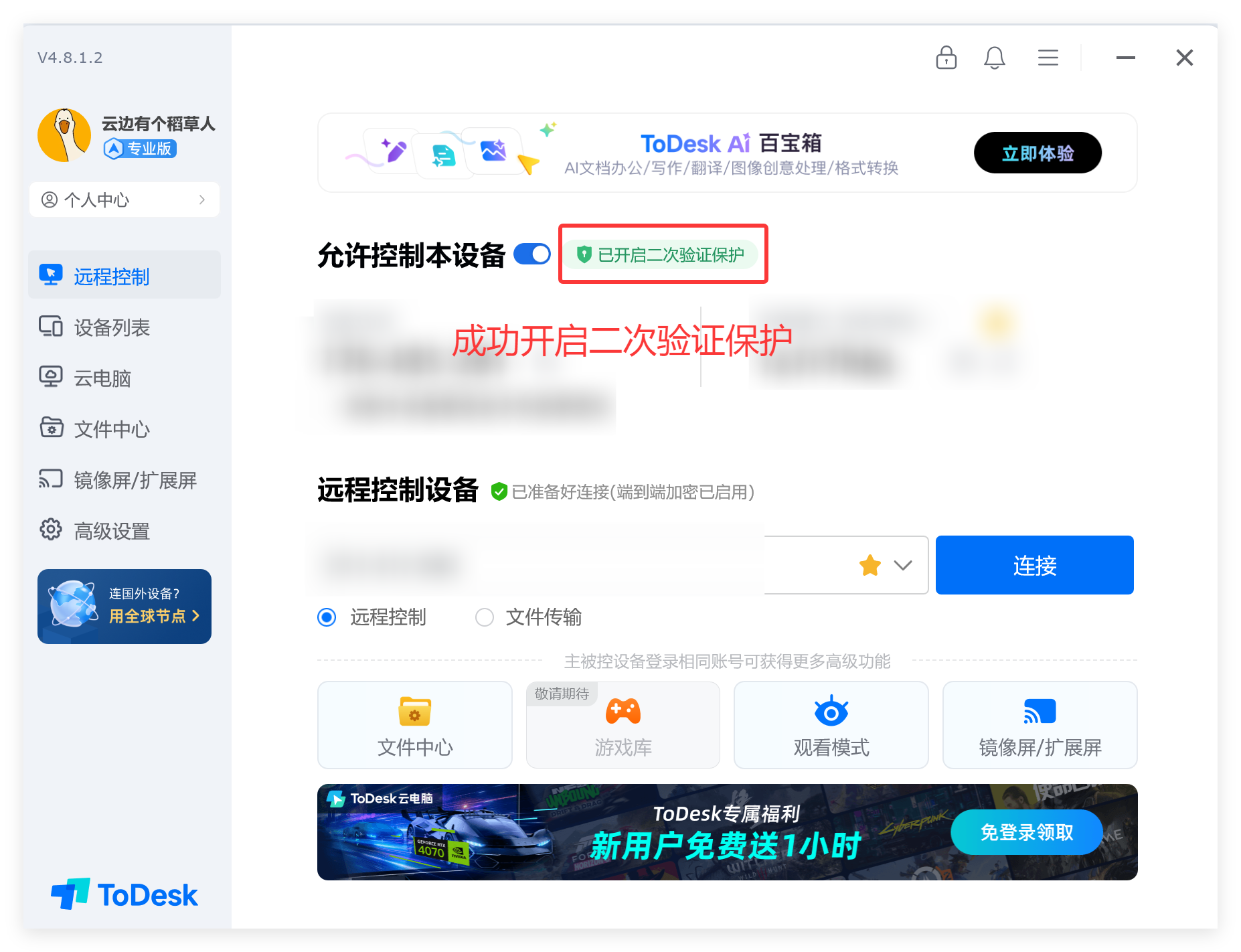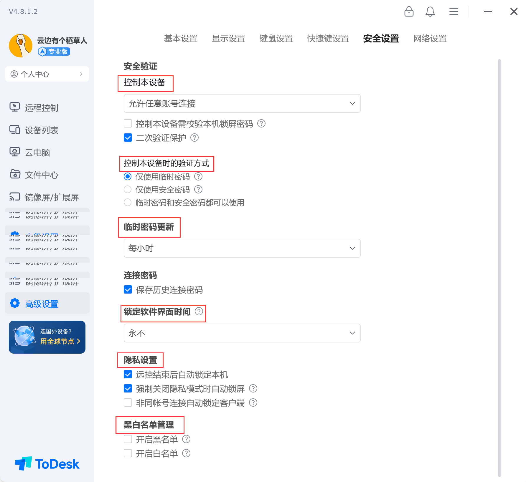 ToDesk权限管理系统功能非常全面,在【高级设置】中的【安全设置】,在这里我们可以进一步提高远程控制的安全性。