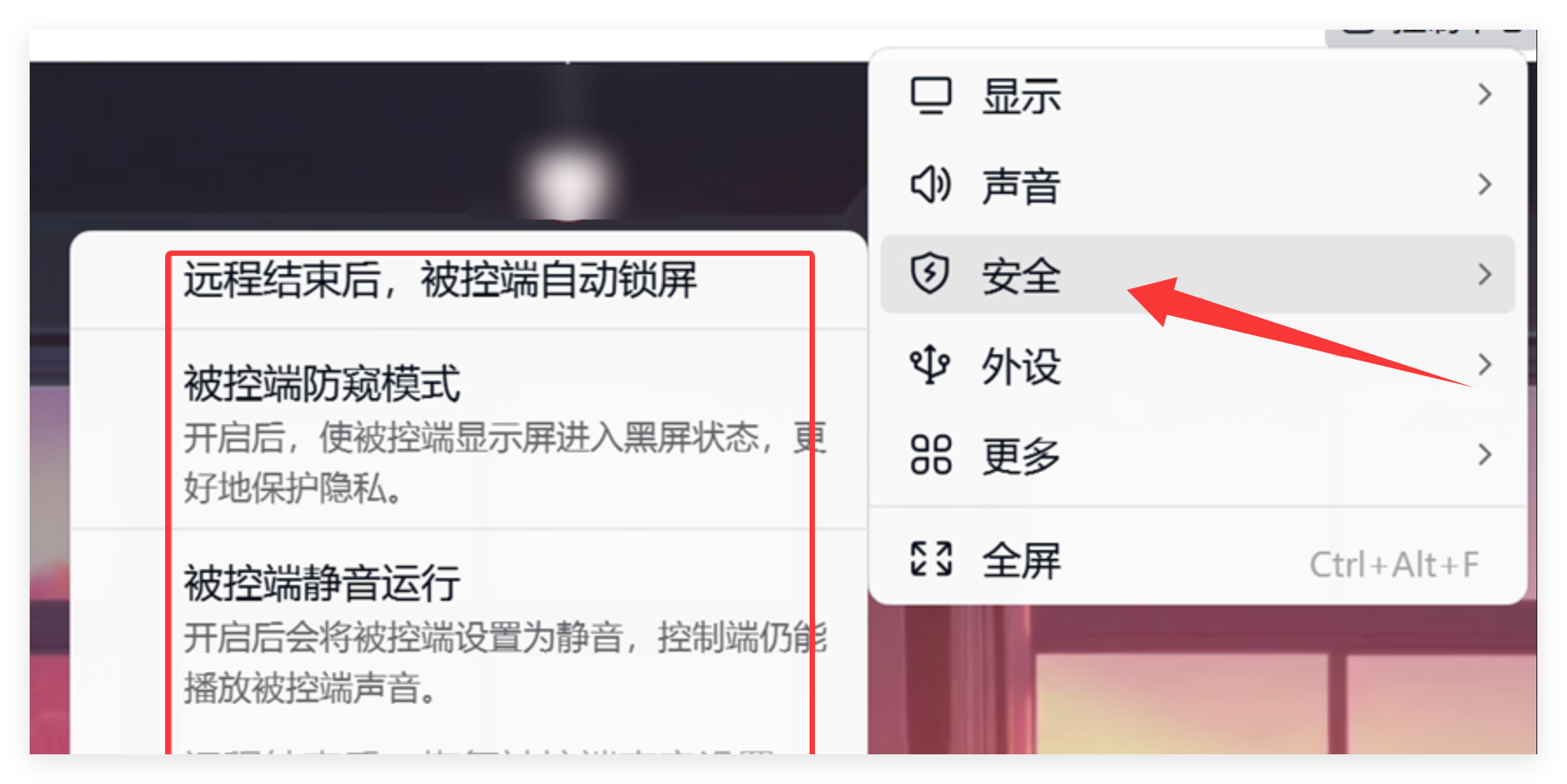 网易UU的安全设置可以在进入控制端后在右上角进行进行设置,整体安全设置比较简单,只有远程结束后被控端自动锁屏,被控端防窥模式和被控端静音运行