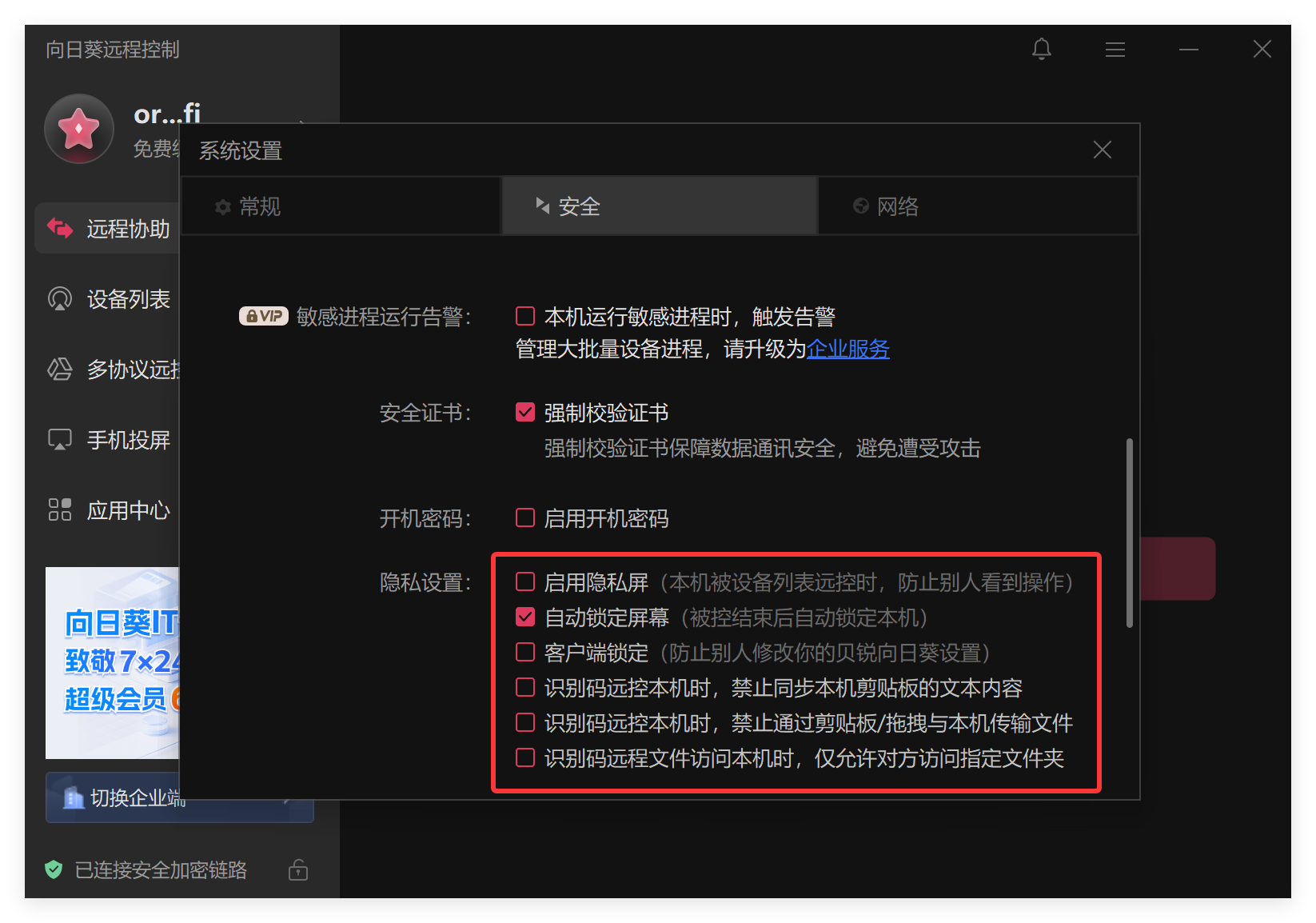 向日葵的隐私设置也比较详细,添加了【客户端锁定】,对应ToDesk的【界面锁定】;识别码远控本机时进制同步本机剪贴板的文本内容/拖拽文件等