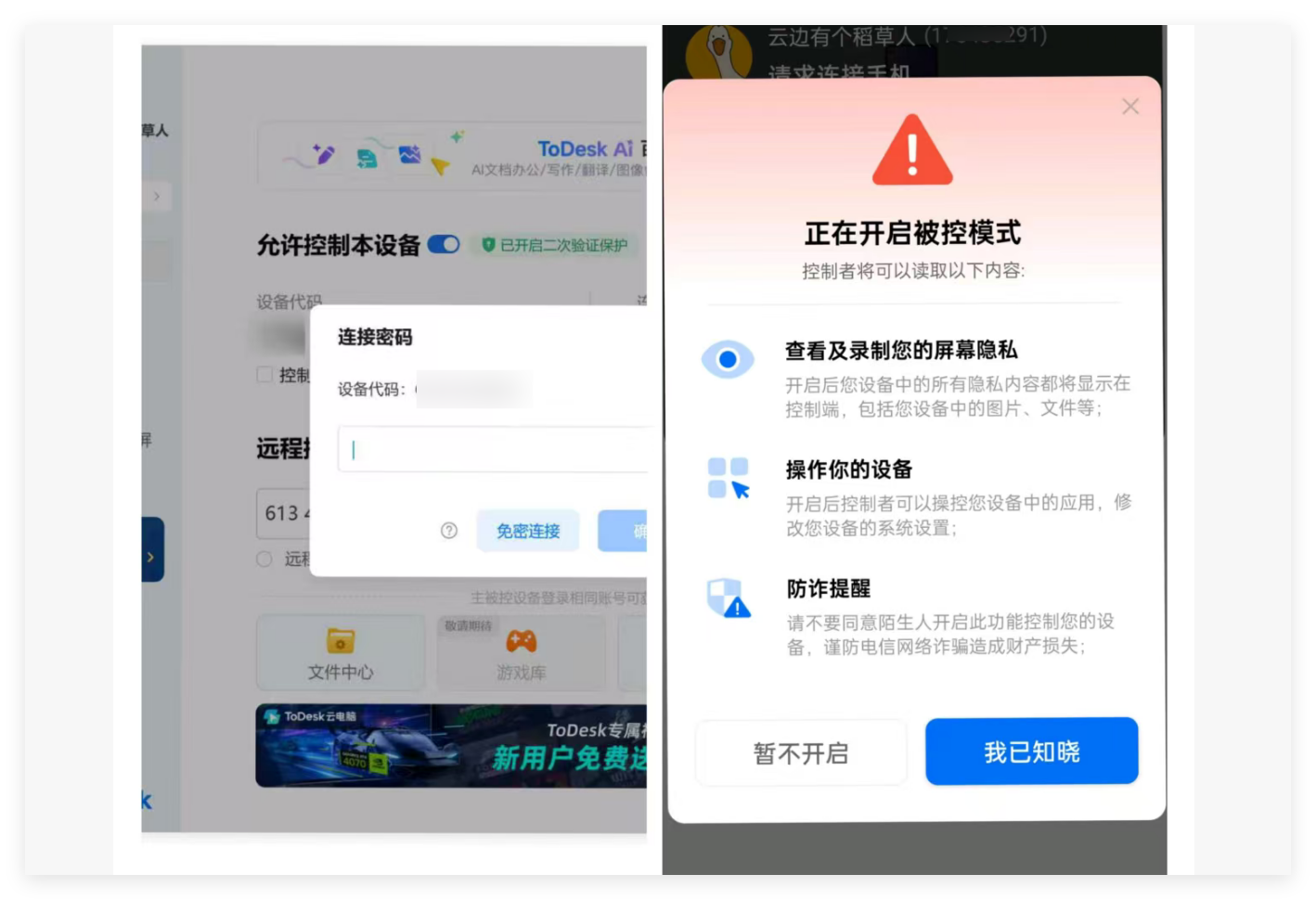(1)手机端控制PC端,首先需要在手机端下载ToDesk,在页面输入远程设备代码,这时可以选择免密连接和密码连接,如果是免密连接需要手机端手动同意一下。同时ToDesk还支持移动端控制PC端锁定屏幕、重启和关机等多样操作