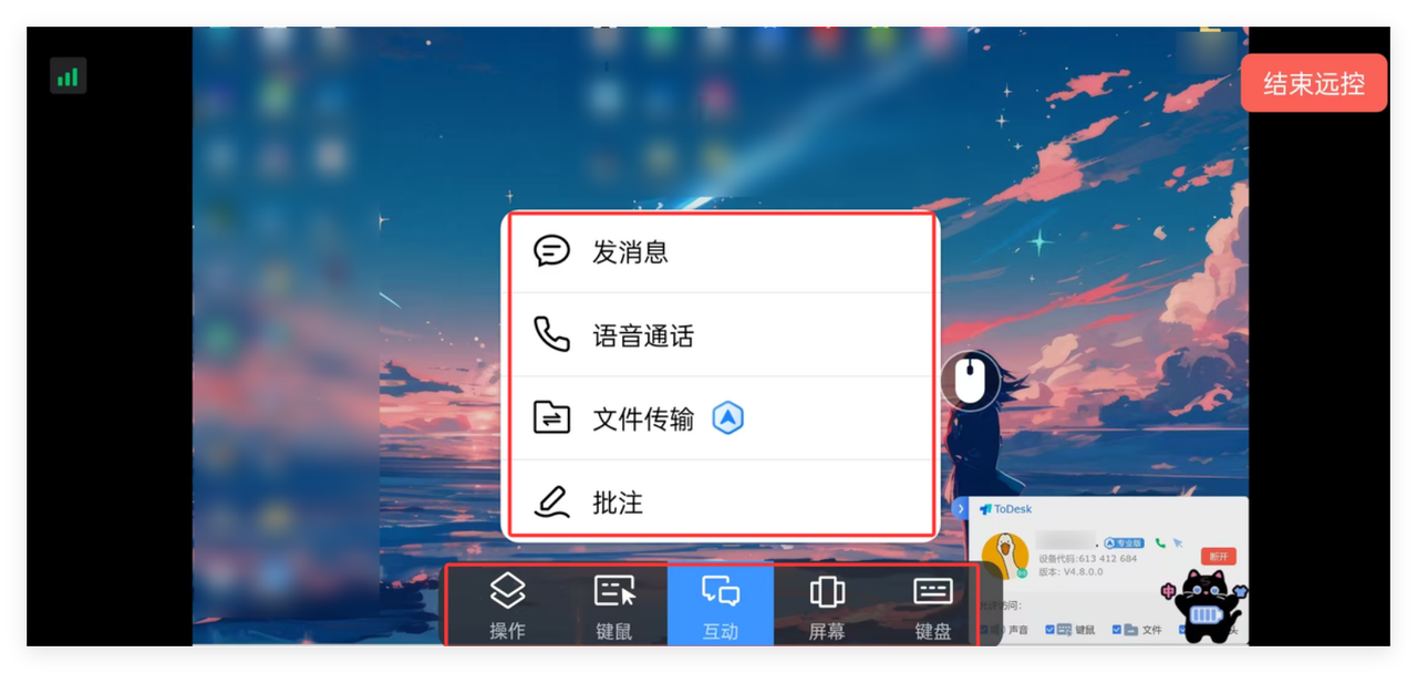在手机端,点击【互动】,可以进行发消息,语音通话,文件传输,批注等操作,提高了远程协助办公的便捷性和高效性