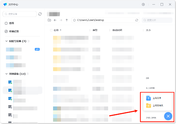 2.在右下角,可以看到➕号,选择上传文件/文件夹,可以将本地的文件/文件夹直接传输到该设备的指定路径;