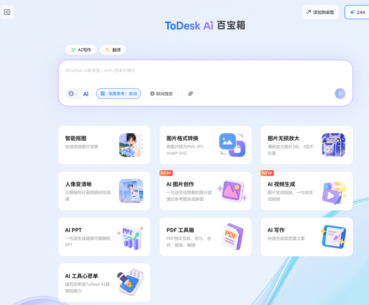 ToDesk客户端有AI 百宝箱功能,能够智能抠图,AI写作,翻译,AI构图防侵权,图片格式转换,AI图片创作,图片无限放大等,多样的功能帮助用户解决了日常工作中的许多繁琐问题,极大地提升了工作体验和生产力。