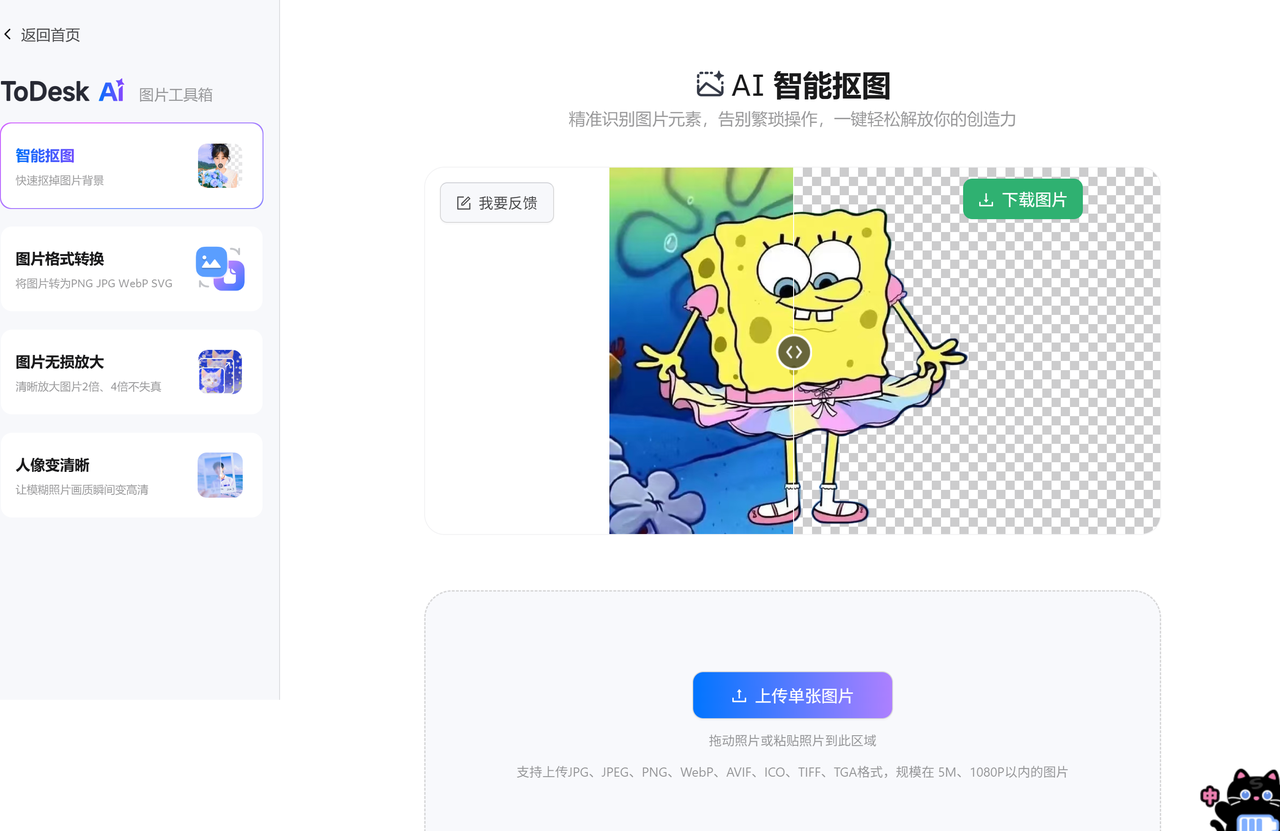 点击上传单张图片,两秒即可完成AI智能抠图操作,效果不错