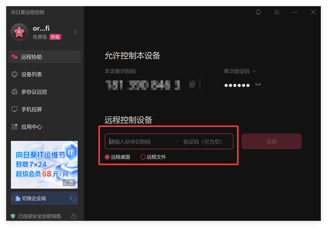 (2)想要在PC端实施远控,同样需要输入伙伴的设备ID和伙伴的设备验证码
