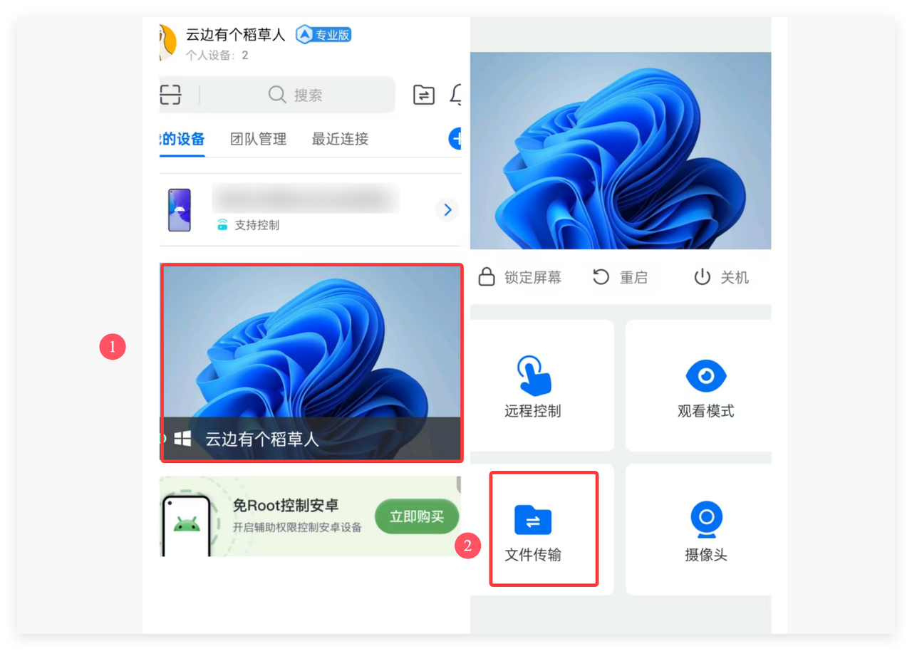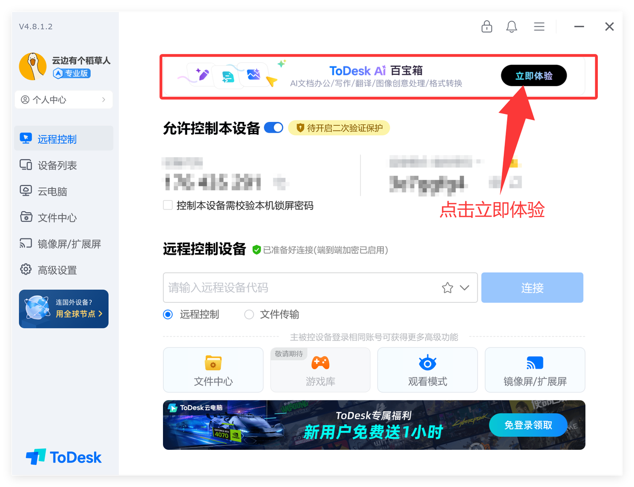 如果有新的设备要加入文件中心,请先在ToDesk客户端内将该设备加入设备列表,即可在文件中心对该设备进行文件管理。