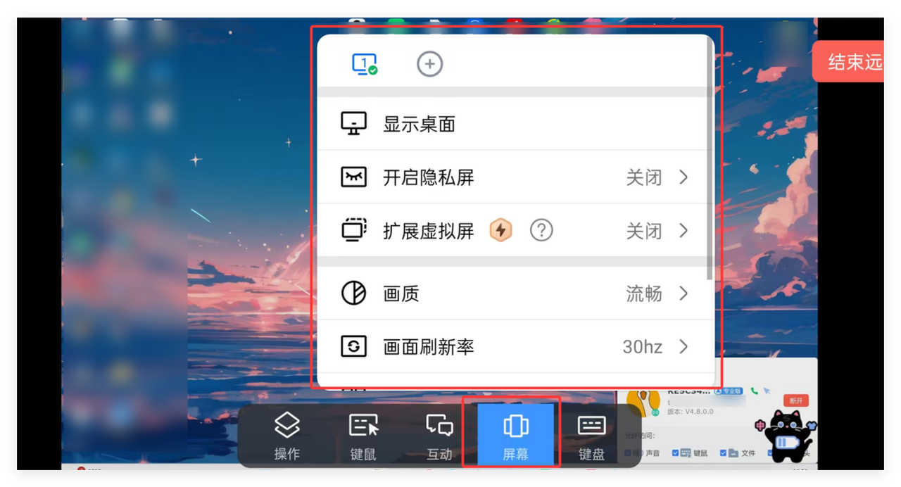 点击【屏幕】,有显示桌面,开启隐私屏,扩展虚拟屏,调整画质和画面刷新率等操作