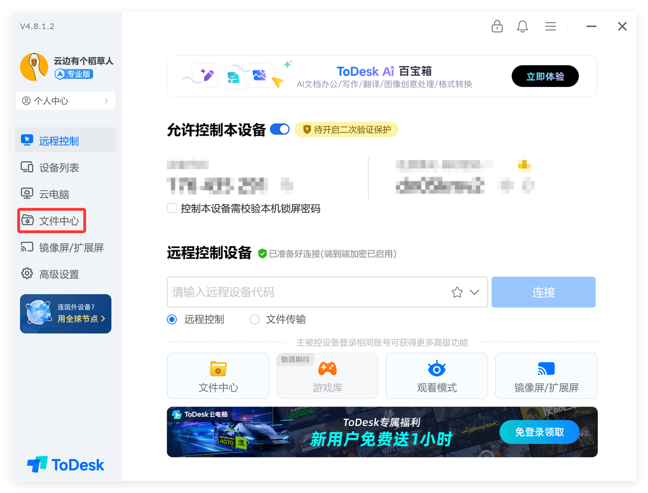 首先在官网下载ToDesk软件,登陆之后见到如下页面,在客户端侧边功能列表点击文件中心