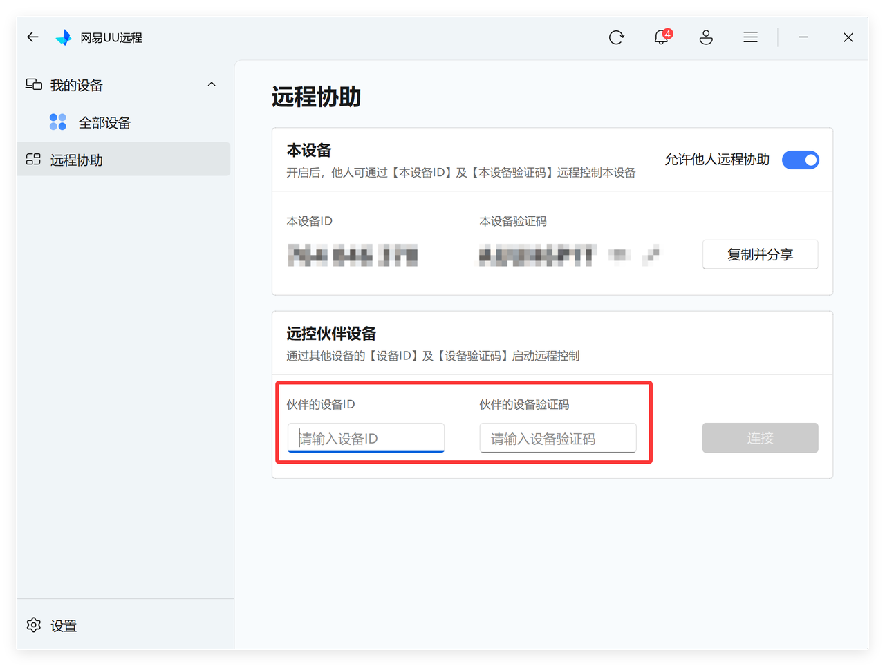 (1)网易UU手机端实施远程协助,需要输入伙伴的设备ID和伙伴的设备验证码