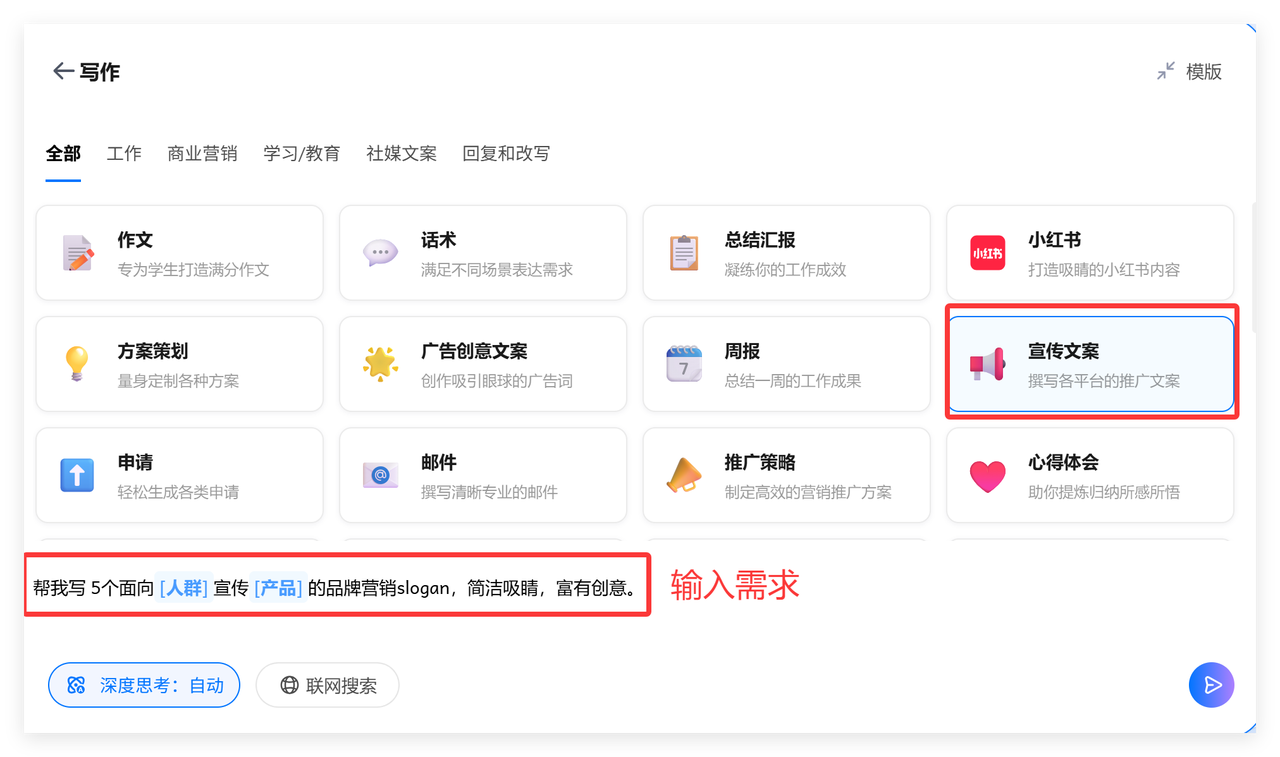 下面我们来体验一下AI写作中专攻宣传文案方面的写作功能。