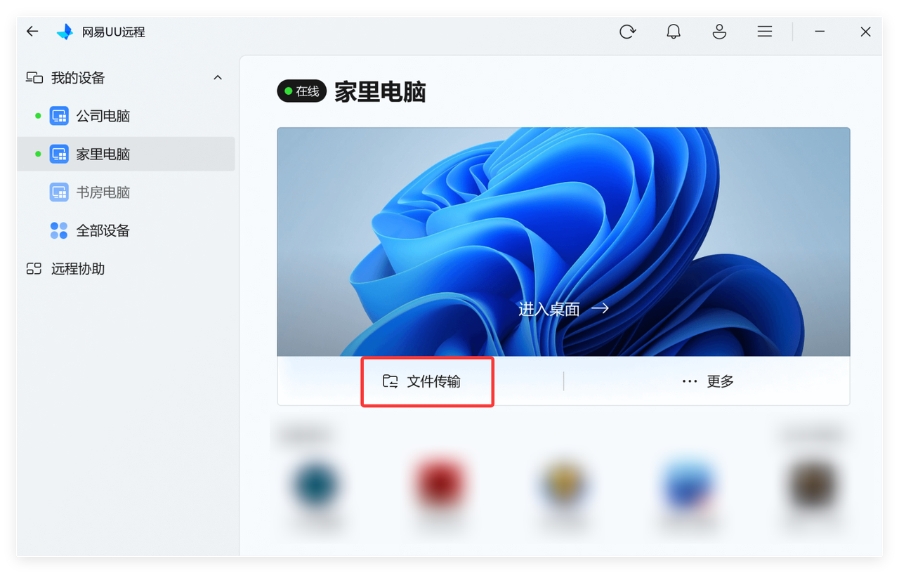 PC端传输文件,首先登录网易UU远程,再在主界面找到在线设备下方文件传输按钮,即可在控制端与被控端之间进行文件互传,传输速度也很快。