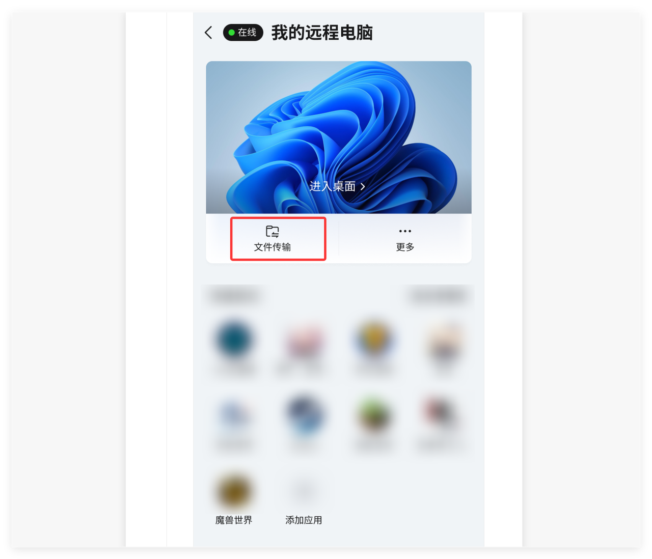 移动端传输文件,首先登录网易UU远程,选择设备后,再找到在线设备下方文件传输按钮,即可发起文件传输,整个过程也很简洁流畅。其他的更多功能就完全没有。