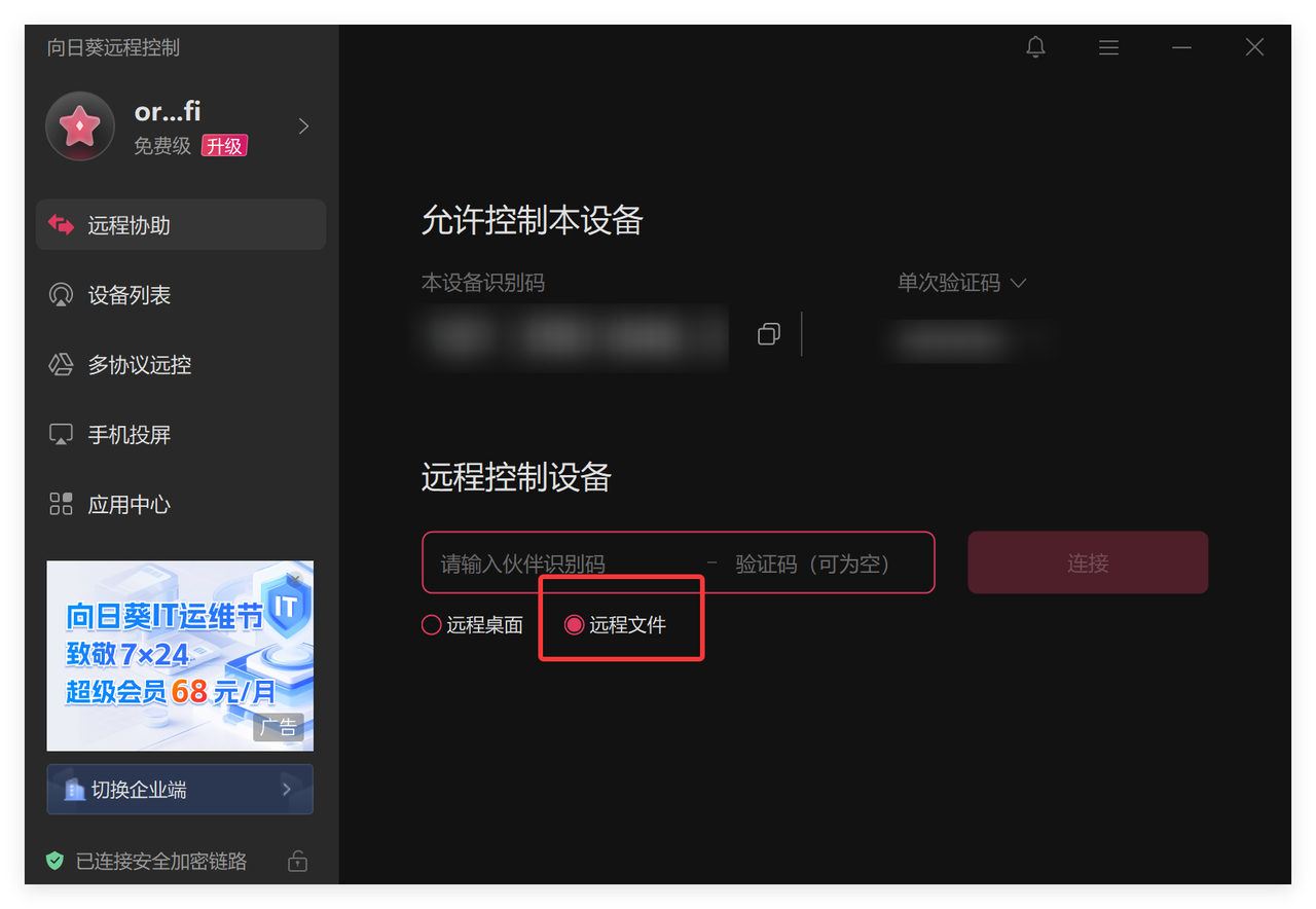 1.首先打开远程控制,选择文件传输,输入远程控制设备的连接密码,成功让主控设备和被控设备建立连接;
