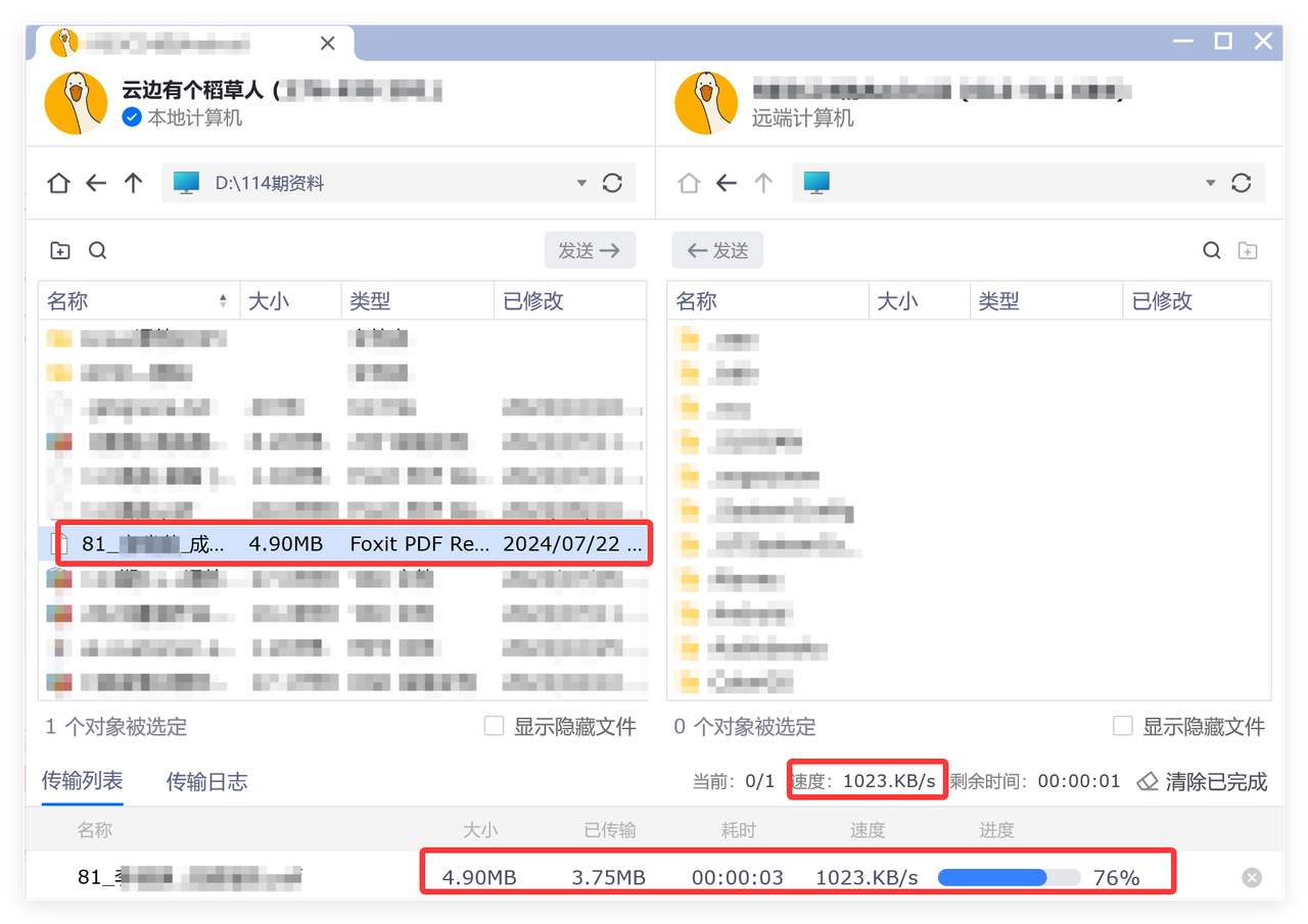 2.点击要传输的文件,拖拽到被控计算机的目标地址即可,整个传输速度很快,当然了,也支持被控向主控传输文件