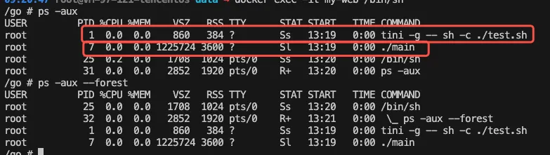 tini服务是init进程,golang服务是子进程服务,符合预期
