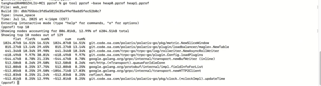 go tool pprof -http=:9998 -base /heap.pprof /heap_after.pprof如果情况不太复杂,可以直接用如下命令在Pod里面查看: