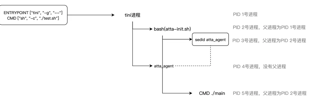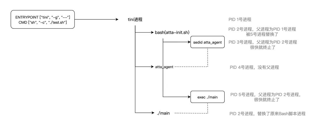 这就导致tini进程虽然会把关闭的信号传递给CMD ./main进程,但如果atta_agent进程和bash进程相比CMD ./main进程先收到且反馈给tini进程已处理信号的话,那tini进程会认为所有子进程或孤儿进程都返回了,tini进程就会主动终止,导致CMD ./main进程突然中止