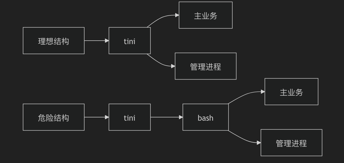 可以看到,三个进程关系平行,被tini管理,前两个可以用tini管理僵尸进程,后一个可以传递信号量