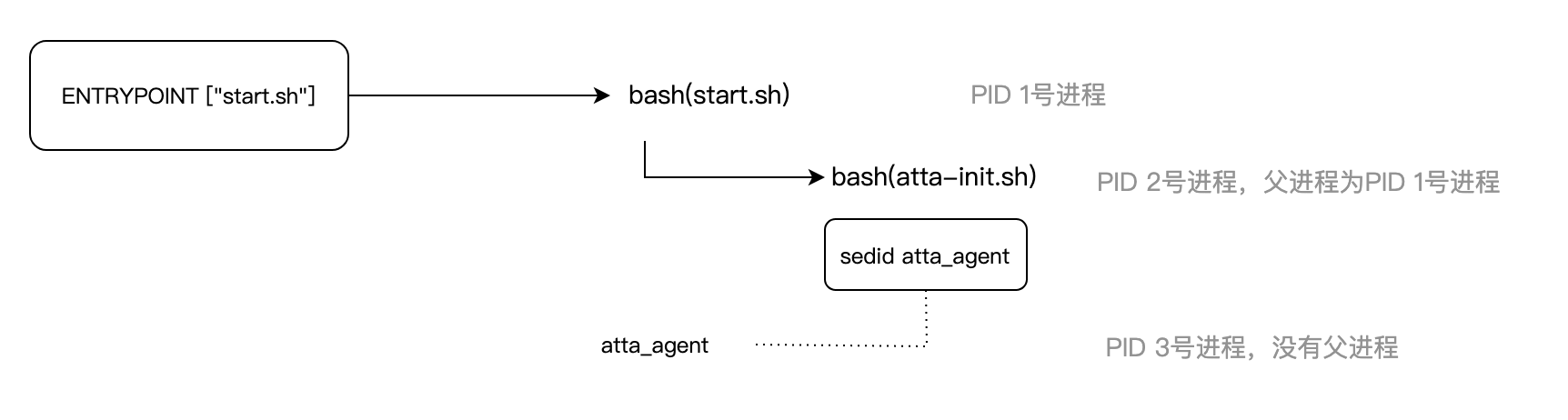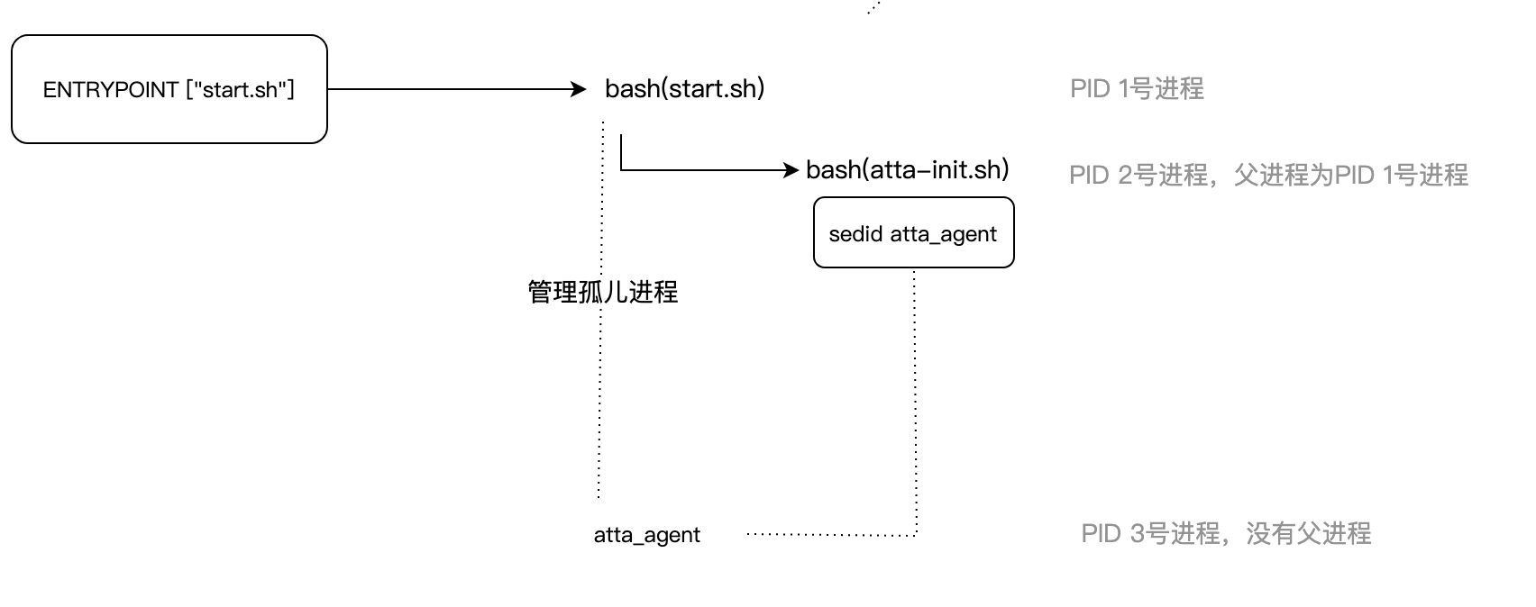 但是,这里有个前提,僵尸进程是Bash进程的子进程才行,但在这个案例里面,Atta-init.sh作为初始脚本,里面会嵌套多个程序,最终使用了setsid命令,导致Atta-init.sh生成的atta_agent进程与Bash进程同级,即非Bash进程的子进程