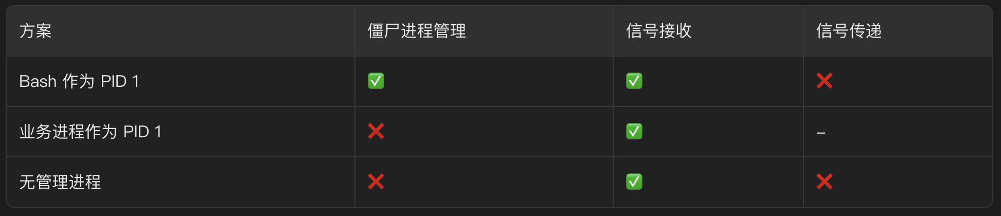 fi维度 | tini+exec方案 | Bash方案 | K8s Lifecycle |