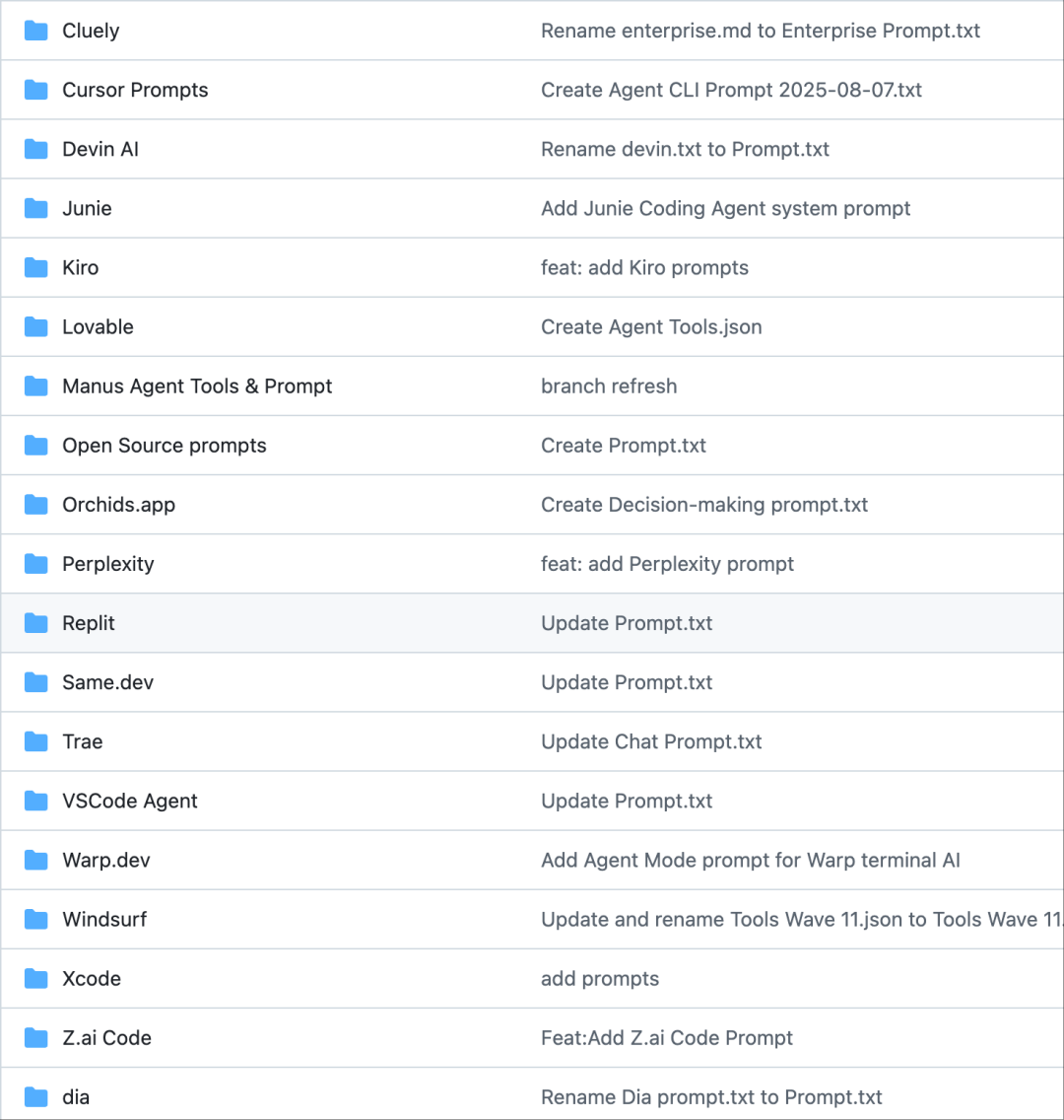 仓库以文件夹形式组织内容,每个文件夹对应一个 AI 工具,包含系统提示词、工具描述和模型配置。以下是部分关键曝光(基于仓库目录,共 12 个主要文件夹+4 个开源提示词集合,超过 20 个 Agent 相关洞见):