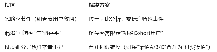此外,也需要注意避免小样本Cohort的结论偏差(如某Cohort仅100人)。同一用户可能在多个Cohort中出现,需根据业务逻辑去重或合并。