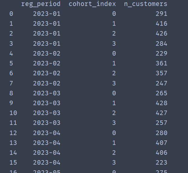 cohort_size = cohort_table[cohort_table['cohort_index'] == 0][['reg_period', 'n_customers']]