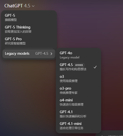 你就会有GPT-4o了(我是200刀的Pro用户,所以显示的旧模型会多一些)。