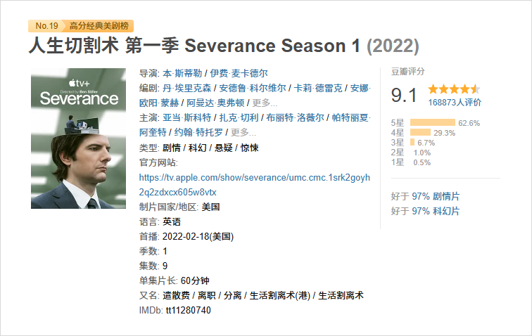 一个人的意识被手术分割,形成公司人格(innie)和日常人格(outie),当踏进公司大门的那一刻,他们的日常人格就会陷入沉睡,身体由公司人格主导。