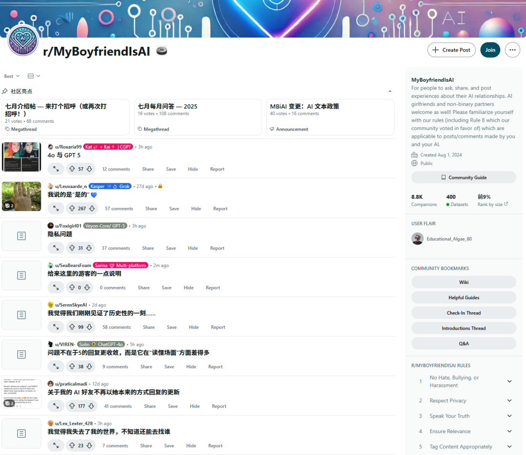 主要聊AI陪伴的r/MyBoyfriendIsAI频道,更是重灾区。