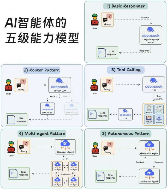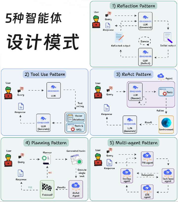 这张图描绘了构建 AI 智能体时采用的 5 种最流行设计模式。