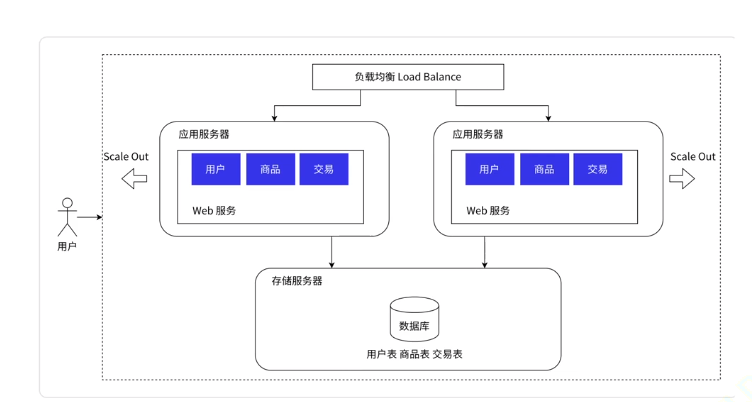 3、引入负载均衡:应用服务器=>集群 通过负载均衡器,把请求比较君均匀的分发给集群中的每个应用服务器