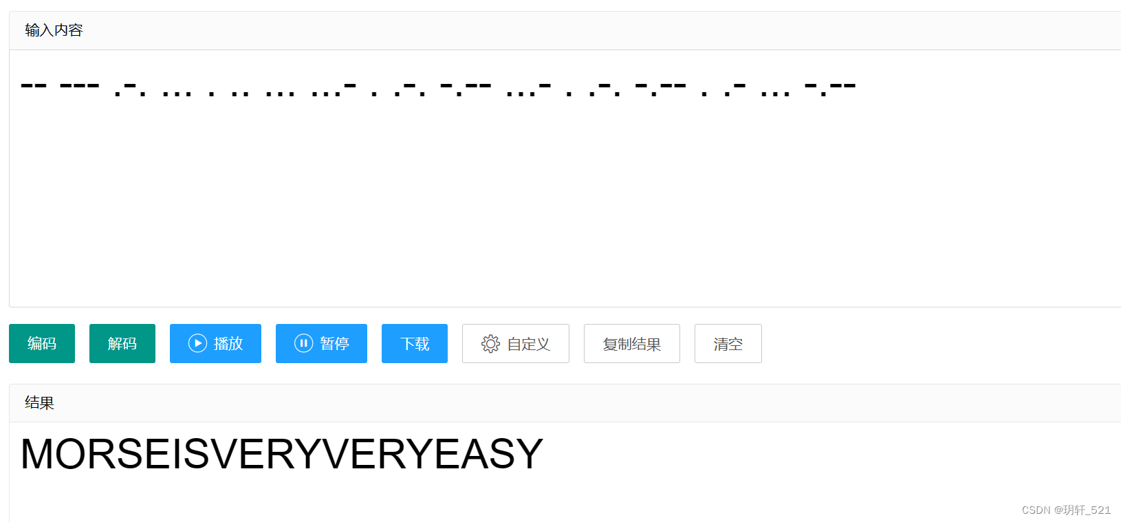使用在线网站,将莫尔斯电码转换为明文字符,将得到的明文转换为小写,作为flag值提交。 在线摩斯密码翻译器 字母大小写转换工具