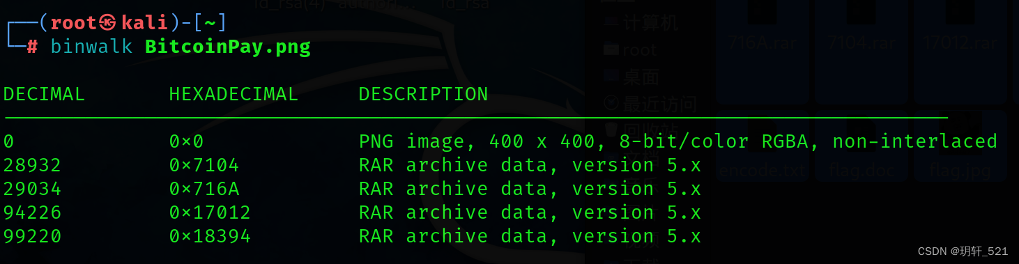 2、放到010 Editor中看一下,没找到什么明显的特征。使用Kali中的binwalk工具进行检测,发现四个rar压缩包。