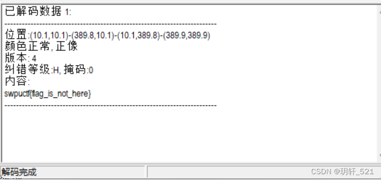 1、使用QR research扫一下,得到“swpuctf{flag_is_not_here}”的提示。