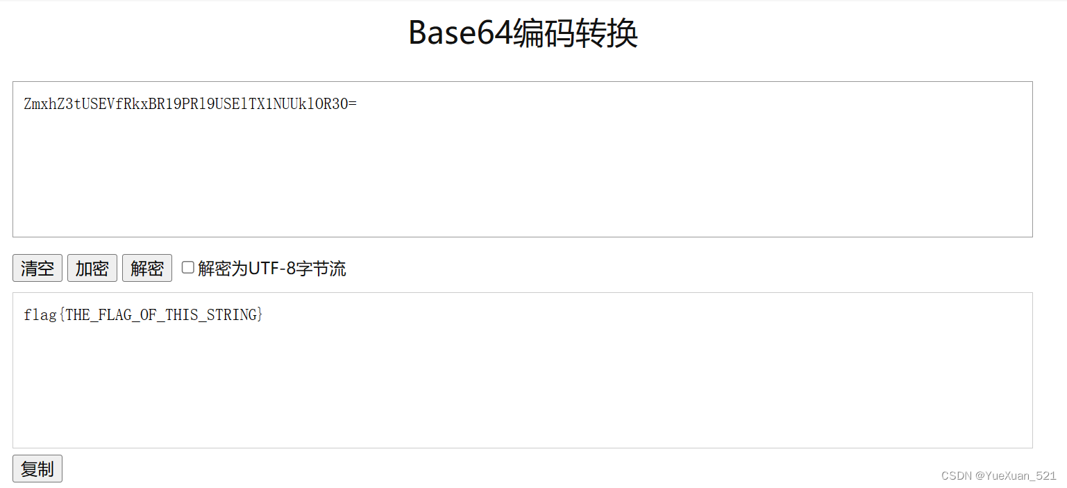 观察发现,密文字符串末尾有“=”,猜测为Base32/64加密。又因为密文中含有小写字母,排除Base32,使用Base64在线解密工具解密,获得flag。