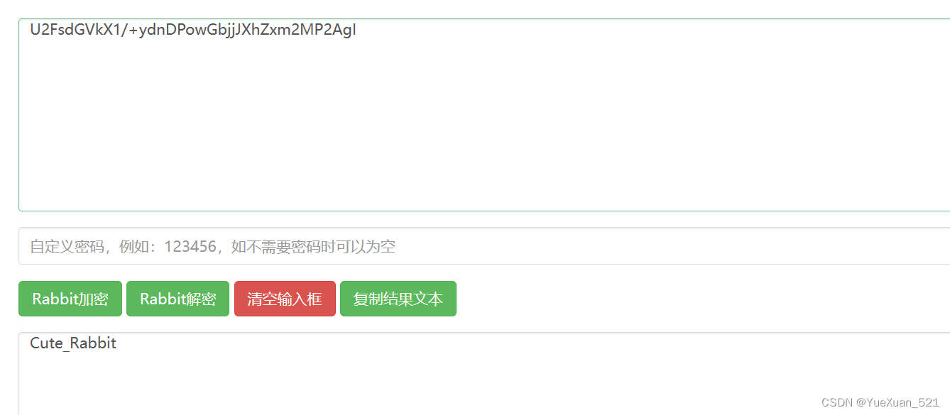 1、根据题目直接得到编码方式,Rabbit编码,使用在线工具进行解密。 Rabbit在线工具