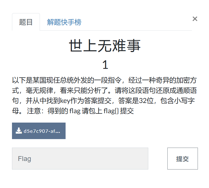 以下是某国现任总统外发的一段指令,经过一种奇异的加密方式,毫无规律,看来只能分析了。请将这段语句还原成通顺语句,并从中找到key作为答案提交,答案是32位,包含小写字母。 注意:得到的 flag 请包上 flag{} 提交