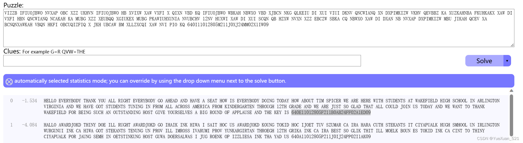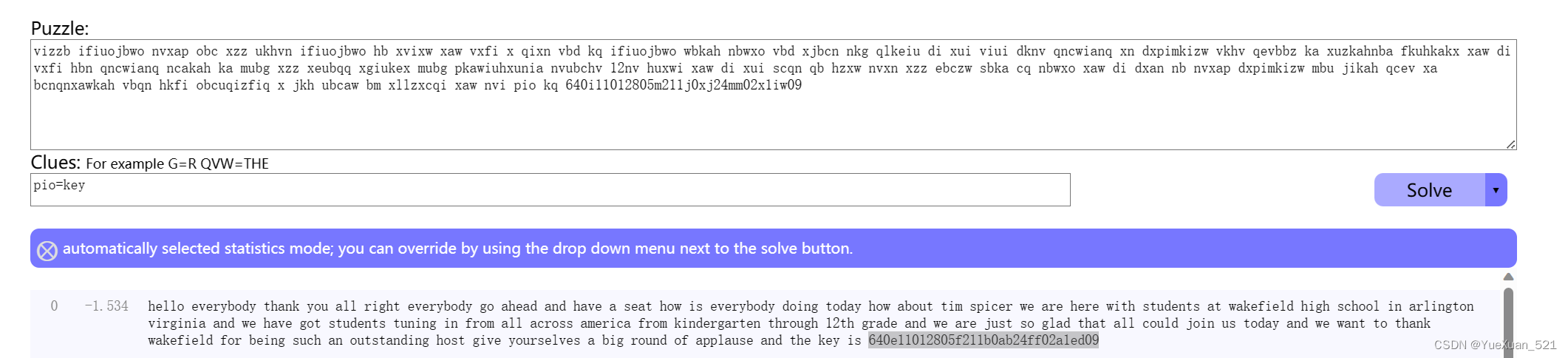 3、根据第一步以及题目中的“key”信息,key=pio,通过工具quipqiup进行暴力破解。