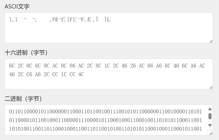 0110110000101100000011000110110010011100101011000000110010000110101011000010110010001100000111000010110001000110001001101010110001100110101001100110110001000110011011001010011010101100010001100010110011000110101001100010110011001100000111001100110001001100将二进制数据转换为ASCII文字,转换出一堆乱码,尝试逆序反转二进制数据再转ASCII文字。 ASCII,十六进制,二进制,十进制,Base64转换器