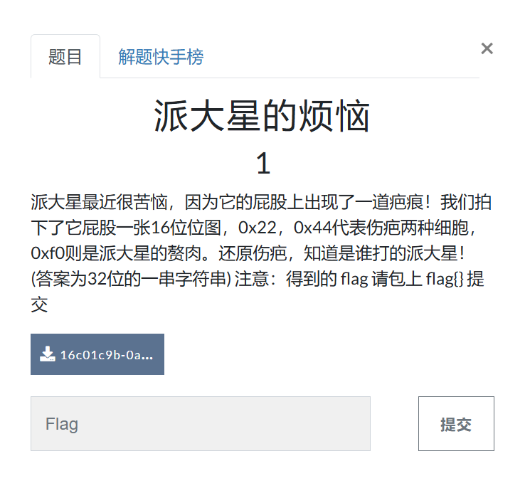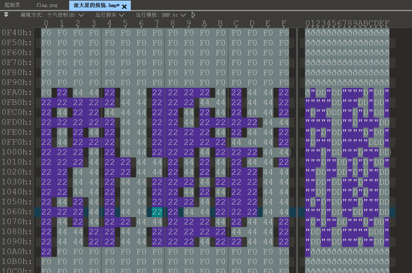 派大星最近很苦恼,因为它的屁股上出现了一道疤痕!我们拍下了它屁股一张16位位图,0x22,0x44代表伤疤两种细胞,0xf0则是派大星的赘肉。还原伤疤,知道是谁打的派大星!(答案为32位的一串字符串) 注意:得到的 flag 请包上 flag{} 提交