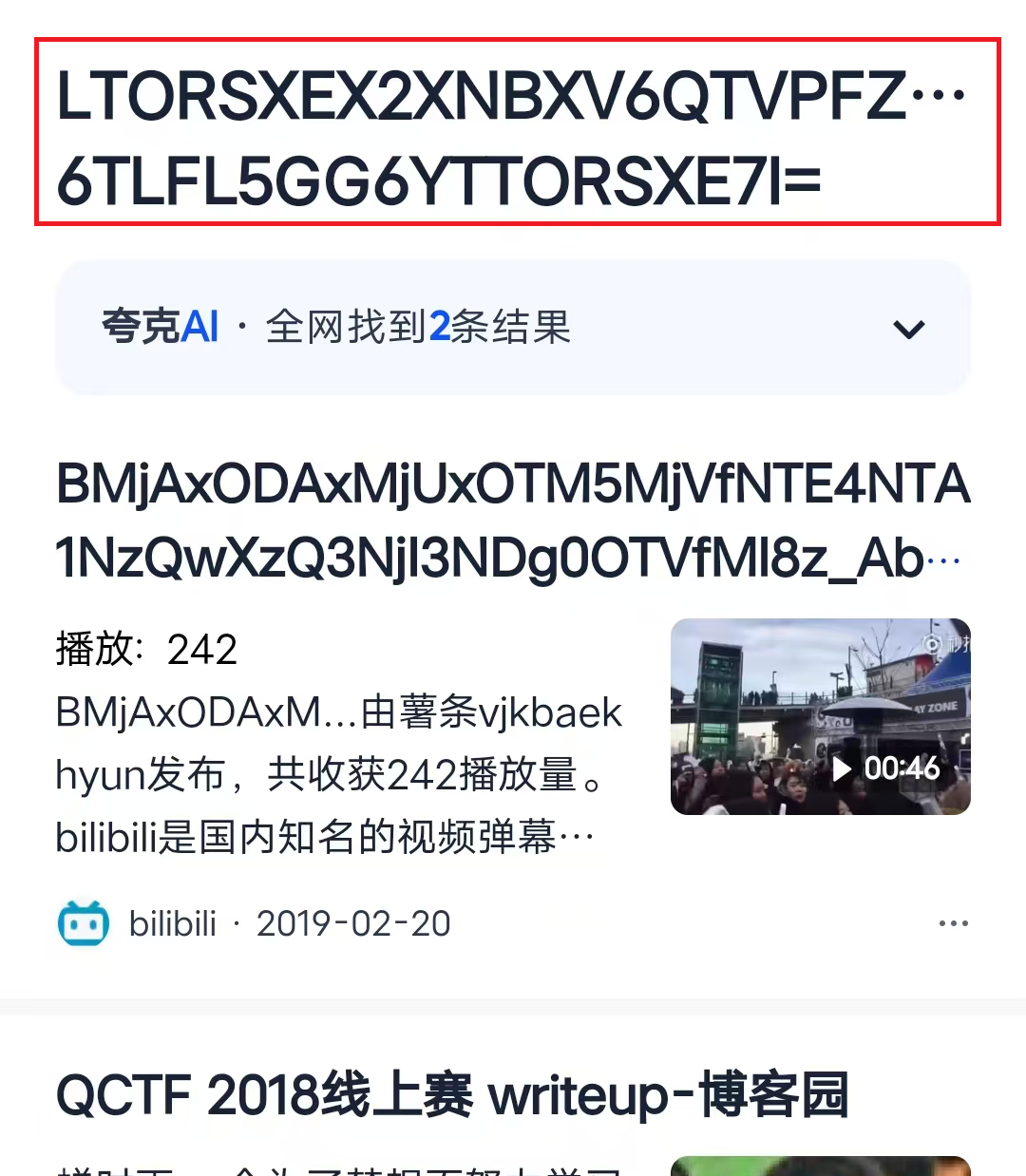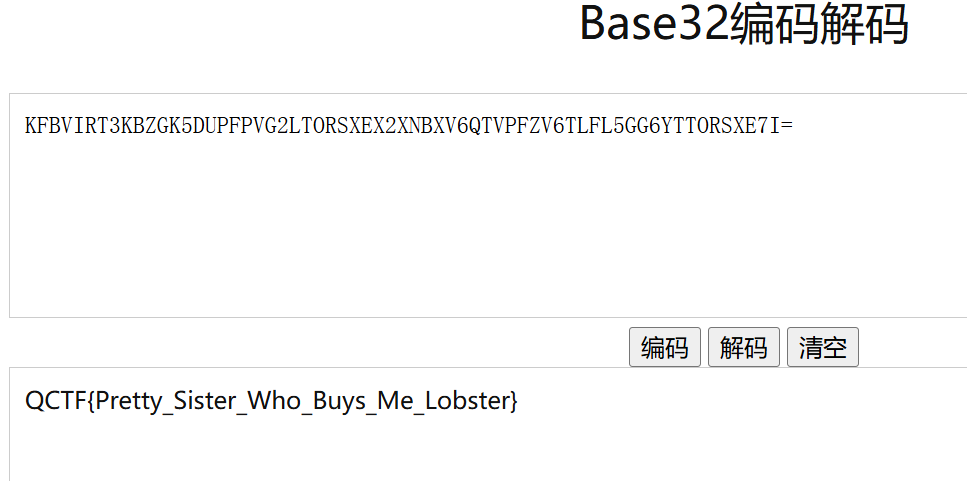 观察密文特征,确定为Base32编码,解明文得到flag:QCTF{Pretty_Sister_Who_Buys_Me_Lobster}