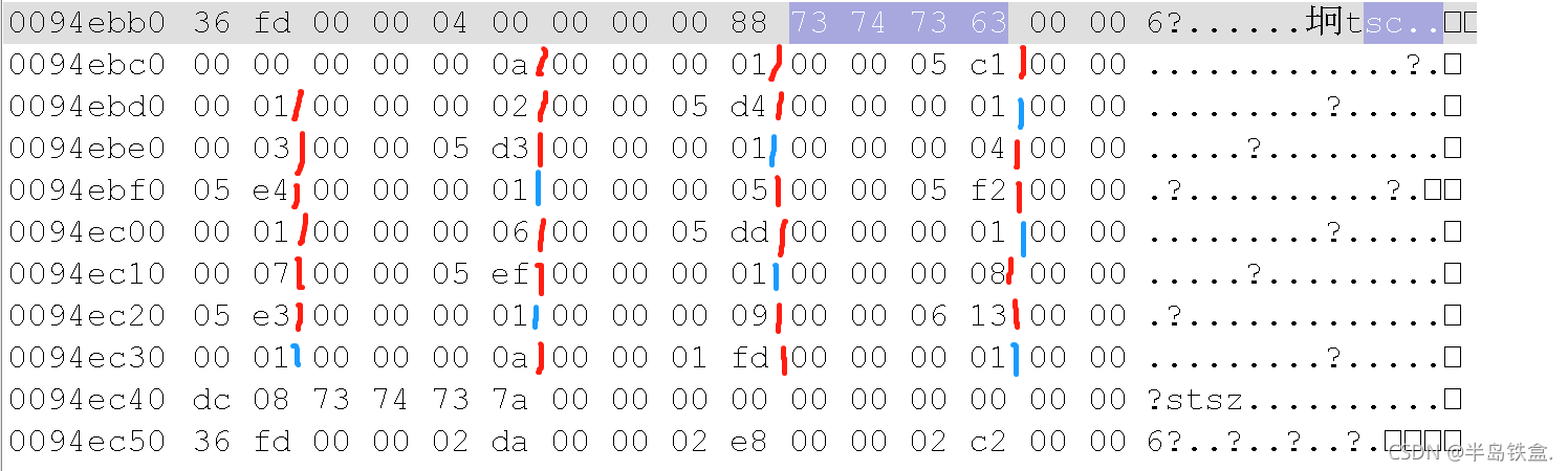 首先,通过对比m4a文件的ftyp(文件标识)和stsc(记录每个trunk的采样数),发现原来是“00”的数据变成了“A1”,ftyp:“66 74 79 70”变为“C7 D5 D8 D1”,stsc:“73 74 73 63”变为“D2 D5 D5 D2”。