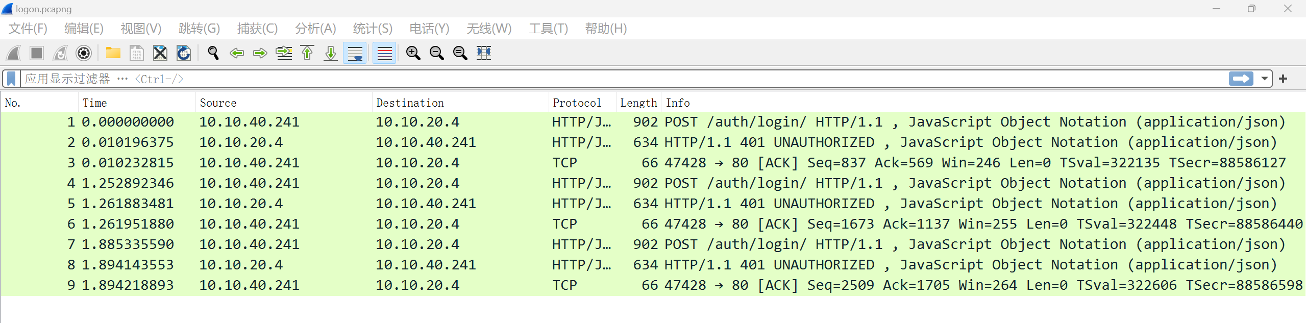1、没想到这道题这么简单。双击logon.pcapng文件,在Wireshark中打开,流量很少。