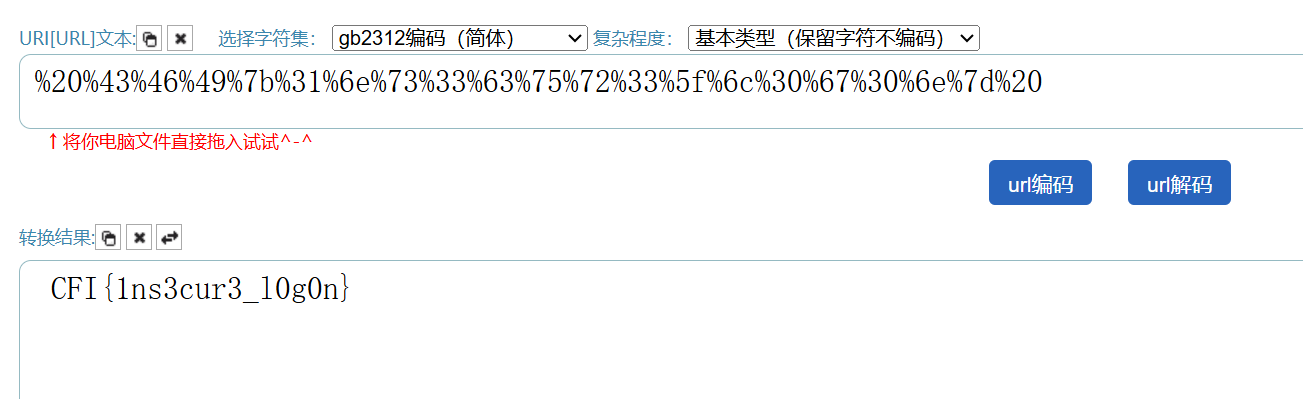 ,使用URL编码。使用在线网站进行解码,得到flag:CFI{1ns3cur3_l0g0n}