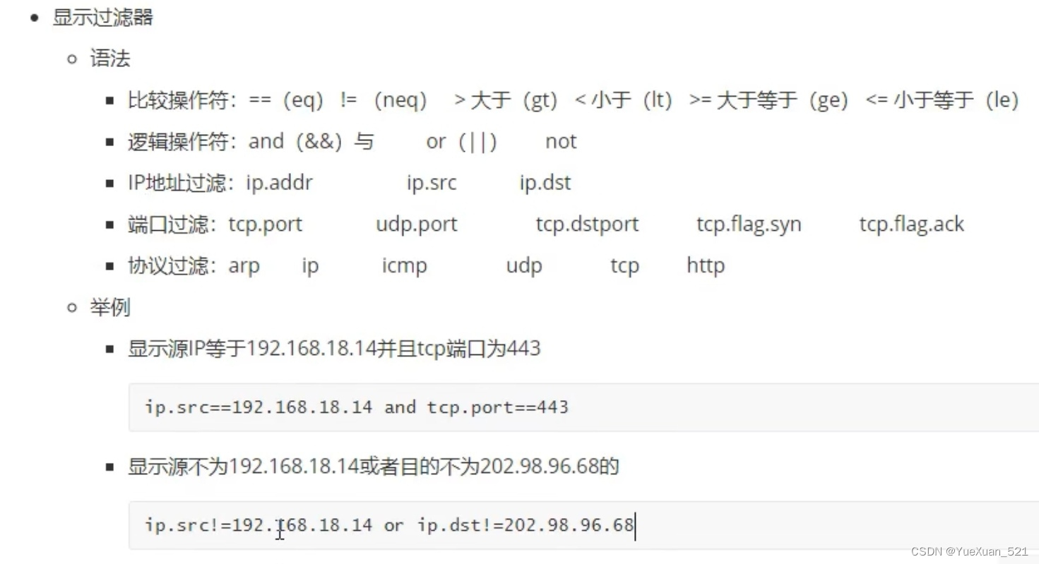 ■比较操作符:==( eq ) !=( neq ) >大于( gt ) <小于( It ) >=大于等于( ge ) <=小于等于( le ) ■逻辑操作符: and (&&)与 or (||) 或 not 非 ■ IP 地址过滤: ip . addr ip . src ip . dst ■端口过滤: tcp . port udp . port tcp . dstport tcp . flag . syn tcp . flag . ack ■协议过滤: arp ip udp tcp icmp http