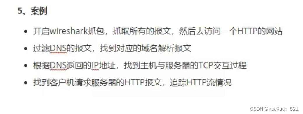 ip . src != 192.68.18.14 or ip . dst !=202.98.96.681、开启 wireshark 抓包,抓取所有的报文,然后去访问一个 HTTP 的网站 2、过滤 DNS 的报文,找到对应的域名解析报文 3、根据 DNS 返回的 IP 地址,找到主机与服务器的 TCP 交互过程 4、找到客户机请求服务器的 HTTP 报文,追踪 HTTP 流情况