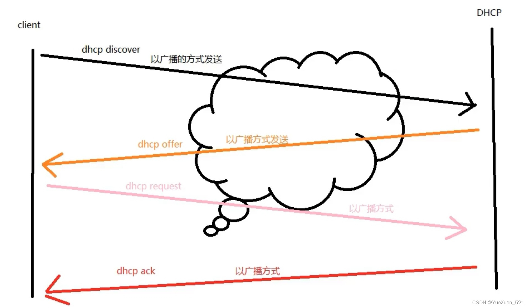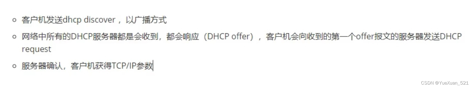 ○客户机发送 dhcp discover ,以广播方式 ○网络中所有的 DHCP 服务器都是会收到,都会响应( DHCP offer ),客户机会向收到的第一个 offer 报文的服务器发送 DHCP request ○服务器确认,客户机获得 TCP / IP 参数